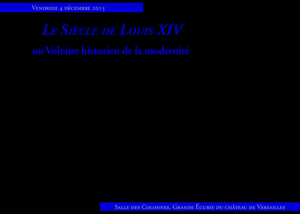 Cette journée d’études a été organisée par Nicholas Cronk et Mathieu da Vinha à l’occasion de la sortie de l’édition critique du Siècle de Louis XIV, sous la direction de Diego Venturino et Nicholas Cronk (Oxford, Voltaire Foundation, coll. « Œuvres complètes de Voltaire »), publiée avec le soutien du Centre de recherche du château de Versailles.