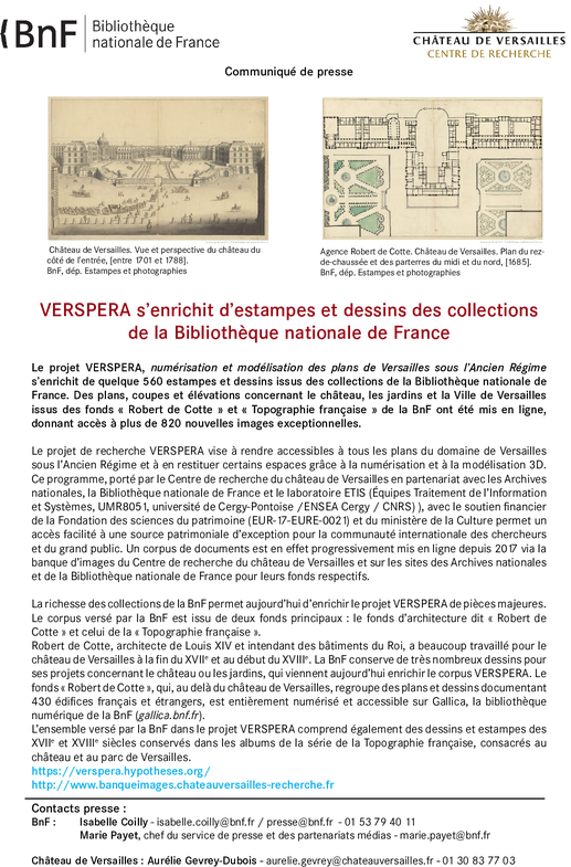En 2023, con motivo del décimo aniversario del proyecto VERSPERA, y a medida que se realizan las operaciones de puesta en línea de los primeros fondos digitalizados, la renovación de esta asociación permite ampliar el corpus virtual inicial. De esta manera, los fondos gráficos vinculados al Versalles del Antiguo Régimen, provenientes de la Bibliothèque municipale de la Ville de Versailles y de los Archives départementales des Yvelines, se unirán a los conservados en los Archives nationales y en la Bibliothèque nationale de France. Una vez en línea, gracias a estos fondos adicionales, el corpus virtual VERSPERA incluirá unas 20 000 imágenes procedentes de casi 10 000 dibujos.