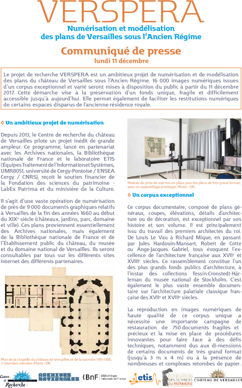 A largo plazo, esta ambiciosa campaña de digitalización tiene la finalidad de poner a disposición del público, de forma gratuita, todo el corpus VERSPERA en el banco de imágenes del Centre de recherche du château de Versailles, es decir varias decenas de miles de imágenes digitales de un corpus excepcional y extremadamente variado (planos generales, secciones, elevaciones, detalles de arquitectura o decoración). Esta iniciativa contribuye a la preservación de estos fondos únicos, frágiles y hasta ahora de difícil acceso, y facilitará a la comunidad internacional de investigadores, y al público en general, la consulta de esta fuente patrimonial.