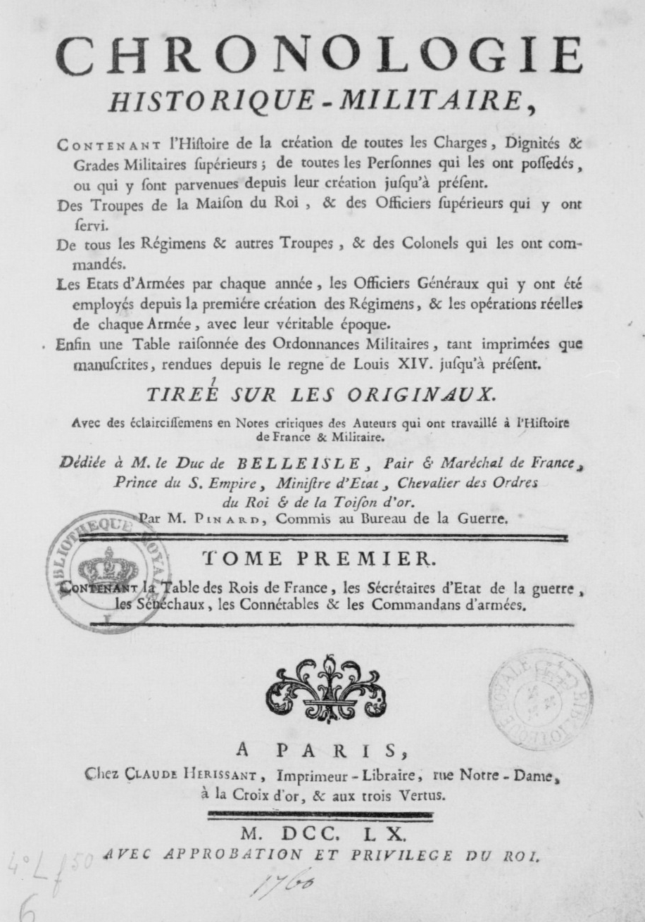 Chronologie historique-militaire [...], éditée par Pinard, Paris, C. Hérissant, 1760, t. I.