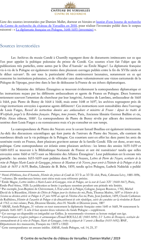 Ces documents d’archives sont dans des états très divers. Les lettres disponibles aux Archives du Musée Condé à Chantilly sont pour la plupart dans un si bon état qu’elles peuvent être directement consultées. Au Ministère des Affaires Étrangères, ou à la Bibliothèque Nationale de France se trouvent au contraire des microfilms à la lisibilité moindre mais néanmoins suffisante. Chantilly offre un autre avantage : en son temps, le duc d’Aumale a inventorié plusieurs volumes de lettres qui disposent d’une table des matières et sont, pour la plupart, classés chronologiquement. Il y a évidemment des erreurs, des imprécisions et des inexactitudes, mais cette aide est néanmoins très précieuse.