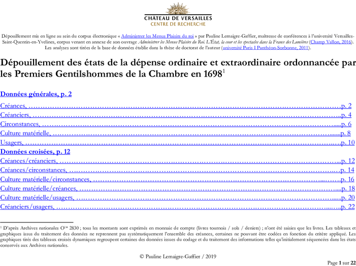 Tous les montants sont exprimés en monnaie de compte (livres tournois / sols / deniers) ; n’ont été saisies que les livres. Les tableaux et graphiques issus du traitement des données ne reprennent pas systématiquement l’ensemble des créances, certaines ne pouvant être codées en fonction du critère appliqué. Les graphiques tirés des tableaux croisés dynamiques regroupent certaines des données issues du codage et du traitement des informations telles qu’initialement séquencées dans les états conservés aux Archives nationales.