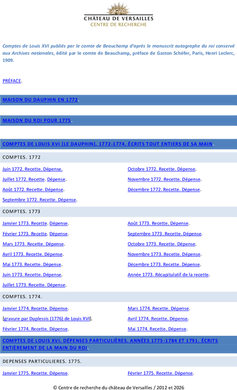 Comptes de Louis XVI publiés par le comte de Beauchamp d’après le manuscrit autographe du roi conservé aux Archives nationales, édités par Raymond de Beauchamp, préface de Gaston Schéfer, Paris, Henri Leclerc, 1909.