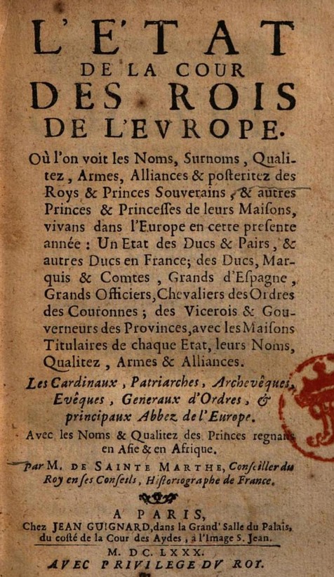Sainte-Marthe (Pierre-Scévole de), L’Etat de la cour des rois de l’Europe, où l’on voit les noms, surnoms, qualitez, armes, alliances & posteritez des roys et princes souverains, & autres princes & princesses de leurs maisons [...], Paris, Jean Guignard, 1680, 4 volumes :