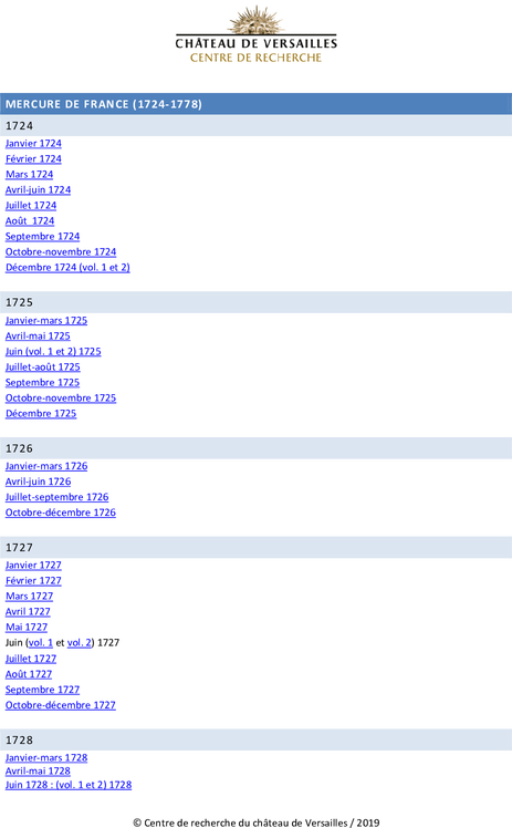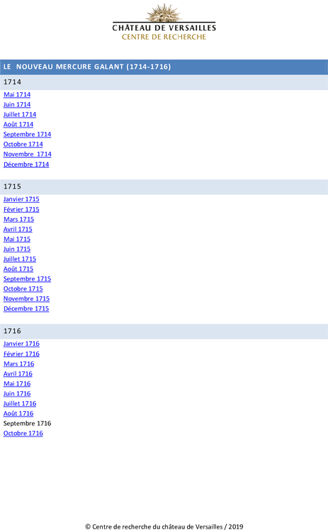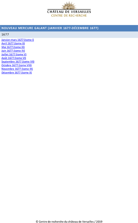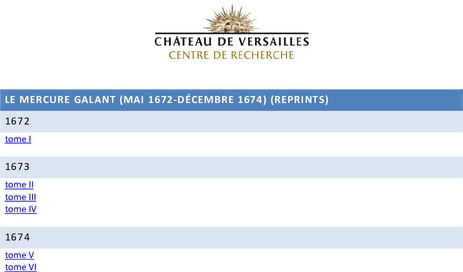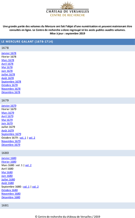 Vincent (Monique ), Mercure Galant, Extraordinaire, Affaires du temps. Table analytique contenant l’inventaire de tous les articles publiés 1672-1710, Paris, Honoré Champion, 1998.