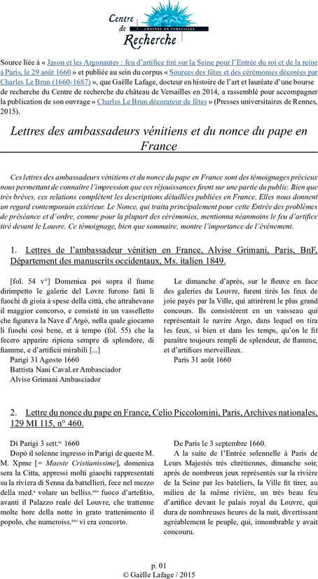 - Ms. italien 1849, fol. 54 vo-55 : copie de la lettre des ambassadeurs vénitiens Battista Nani et Alvise Grimani datée du 31 août 1660.