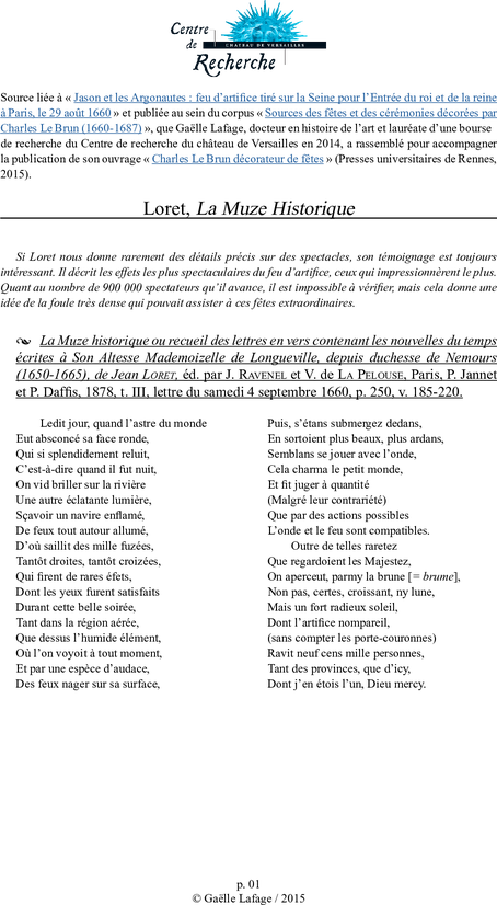 La Muze historique ou recueil des lettres en vers contenant les nouvelles du temps écrites à Son Altesse Mademoizelle de Longueville, depuis duchesse de Nemours (1650-1665), de Jean Loret, éd. par J. Ravenel et V. de La Pelouse, Paris, P. Jannet et P. Daffis, 1878, t. III, p. 250, v. 185-220.