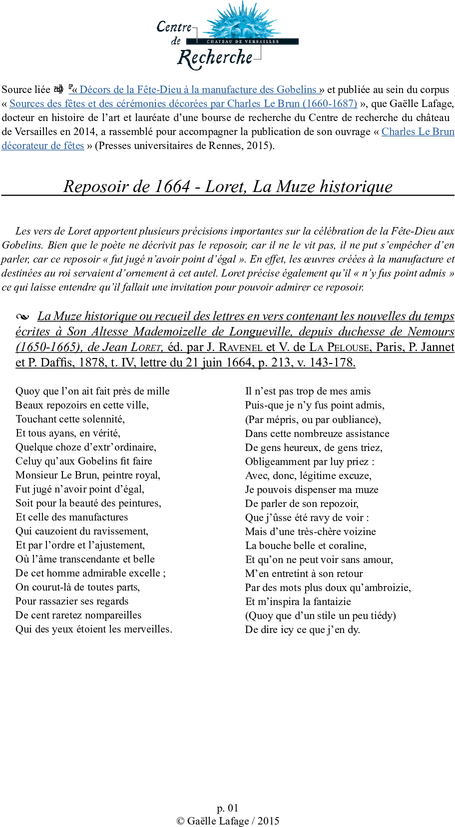 La Muze historique ou recueil des lettres en vers contenant les nouvelles du temps écrites à Son Altesse Mademoizelle de Longueville, depuis duchesse de Nemours (1650-1665), de Jean Loret, éd. par J. Ravenel et V. de La Pelouse, Paris, P. Jannet et P. Daffis, 1878, t. IV, p. 213.