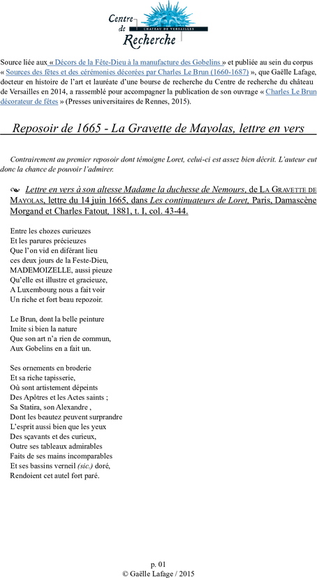 Lettre en vers, de La Gravette de Mayolas, dans Les continuateurs de Loret, Paris, Damascène Morgand et Charles Fatout, 1881, t. I, col. 43-44.