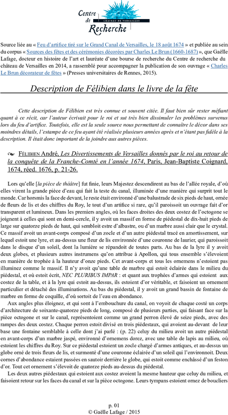 FÉLIBIEN André, Les Divertissements de Versailles donnés par le roi au retour de la conquête de la Franche-Comté en l’année 1674, Paris, J.?B. Coignard, 1674, rééd. avec planches, Imprimerie Royale, 1676, p. 21-26.