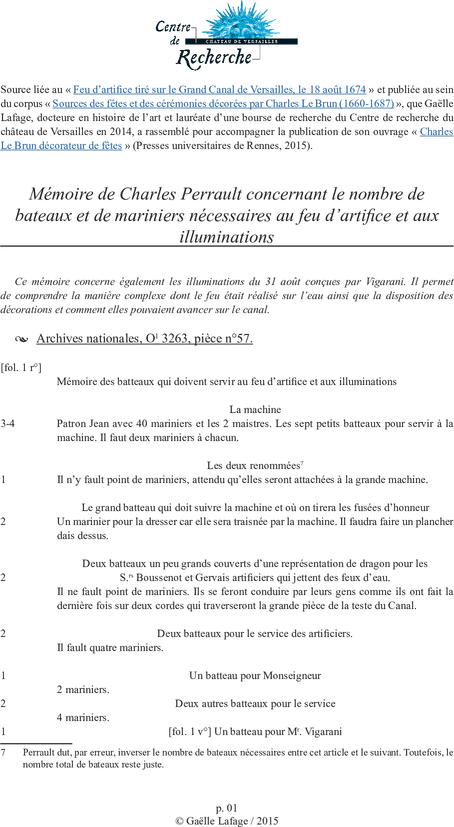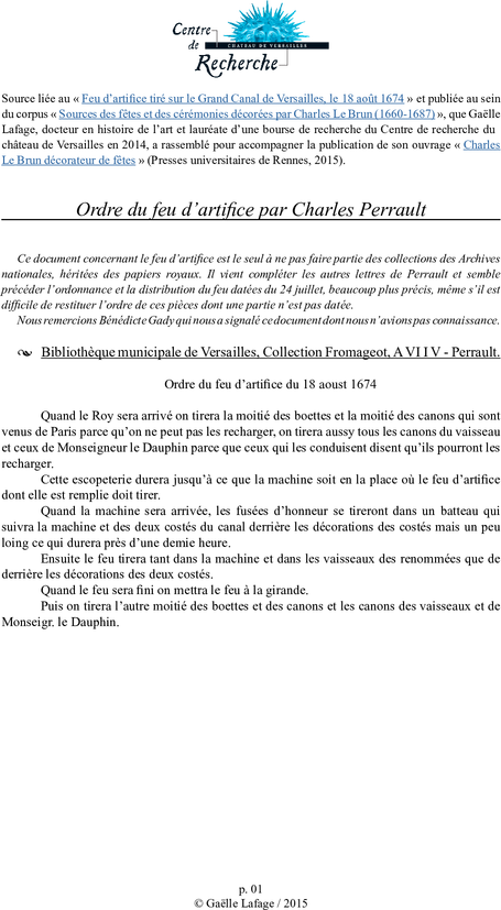 Sept lettres et mémoires concernant ce feu d’artifice sont conservés, dont six aux Archives nationales. Un ancien inventaire des pièces concernant ces fêtes aux Archives, mentionne également une lettre aujourd’hui disparue de Perrault, numérotée 7 et intitulée : « Proposition de faire une illumination sur le grand Canal de Versailles ». Cette abondance de sources est très rare. Ces lettres permettent de restituer les préparatifs du feu d’artifice du début à la fin ainsi que son déroulement précis. Des plans, aujourd’hui disparus, accompagnaient les instructions numérotées 9 et 10 de Perrault. Nous avons tenté d’en faire une restitution (placée à la suite des lettres), mais le manque de détails sur les lieux concernés ne nous a pas permis de représenter la totalité des points de lancement des fusées.