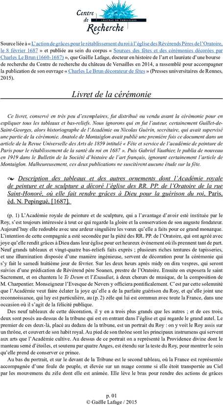 Description des tableaux et des autres ornemens dont l’Académie royale de peinture et de sculpture a décoré l’église des RR. PP. de l’Oratoire de la rue Saint-Honoré, où elle fait rendre grâces à Dieu pour la guérison du roi, Paris, N. Pepingué, [1687].