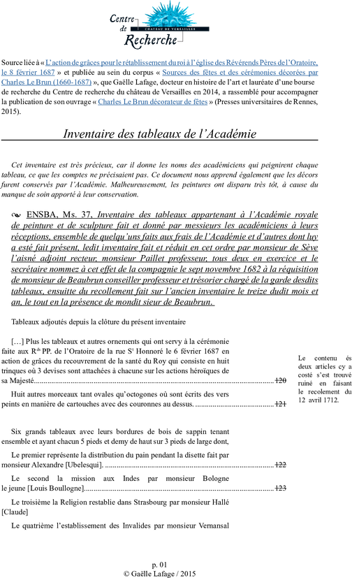 - Ms. 37 : Inventaire des tableaux appartenant à l’Académie royale de peinture et de sculpture fait et donné par messieurs les académiciens à leurs réceptions, ensemble de quelqu’uns faits aux frais de l’Académie et d’autres dont luy a esté fait présent, ledit inventaire fait et réduit en cet ordre par monsieur de Sève l’aisné adjoint recteur, monsieur Paillet professeur, tous deux en exercice et le secrétaire nommez à cet effet de la compagnie le sept novembre 1682 à la réquisition de monsieur de Beaubrun conseiller professeur et trésorier chargé de la garde desdits tableaux, ensuitte du recollement fait sur l’ancien inventaire le treize dudit mois et an, le tout en la présence de mondit sieur de Beaubrun.