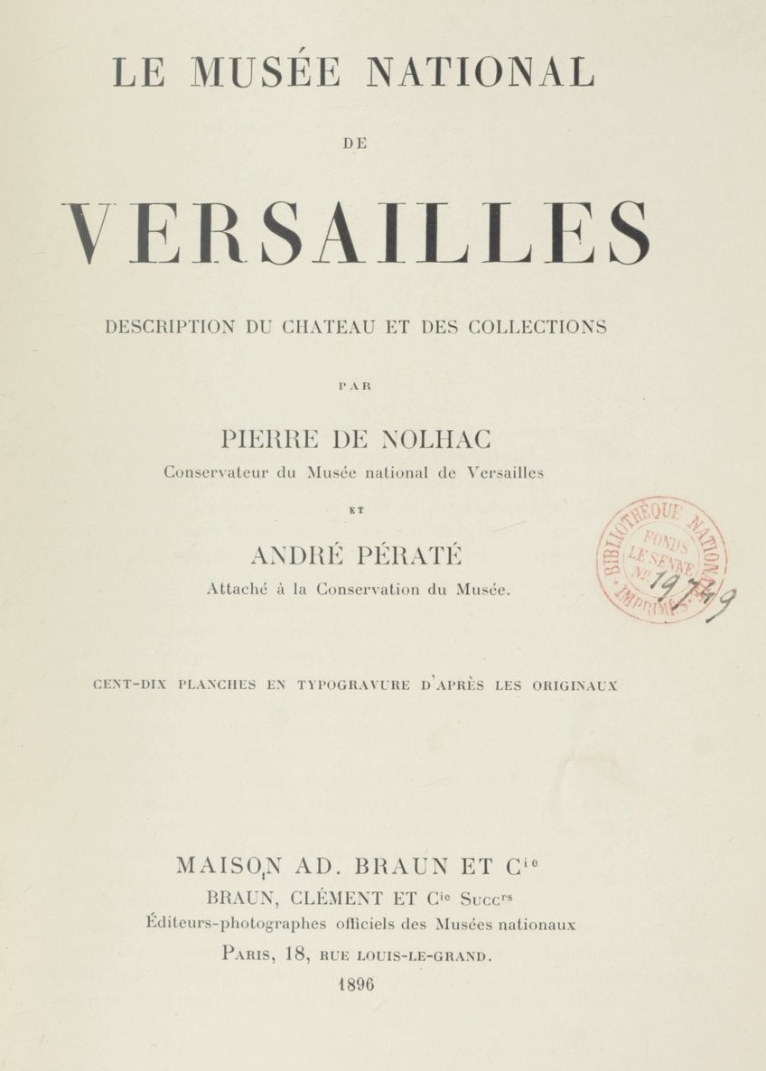 - 1896 : Nolhac (Pierre de) et Pératé (André), Le Musée national de Versailles : description du château et des collections, Paris, Braun, 1896.