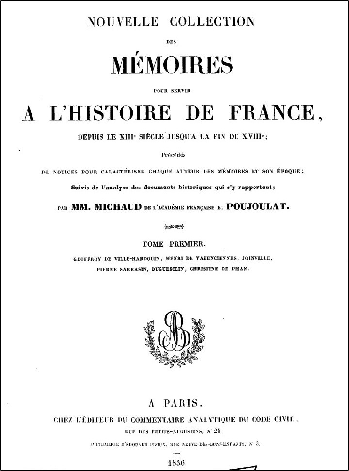 Nouvelle collection des Mémoires relatifs à l’histoire de France [...], publiée par J.-F. Michaud et J.-J.-F. Poujoulat, Paris, chez l’éditeur du commentaire analytique du Code civil, 1836, t. I.
