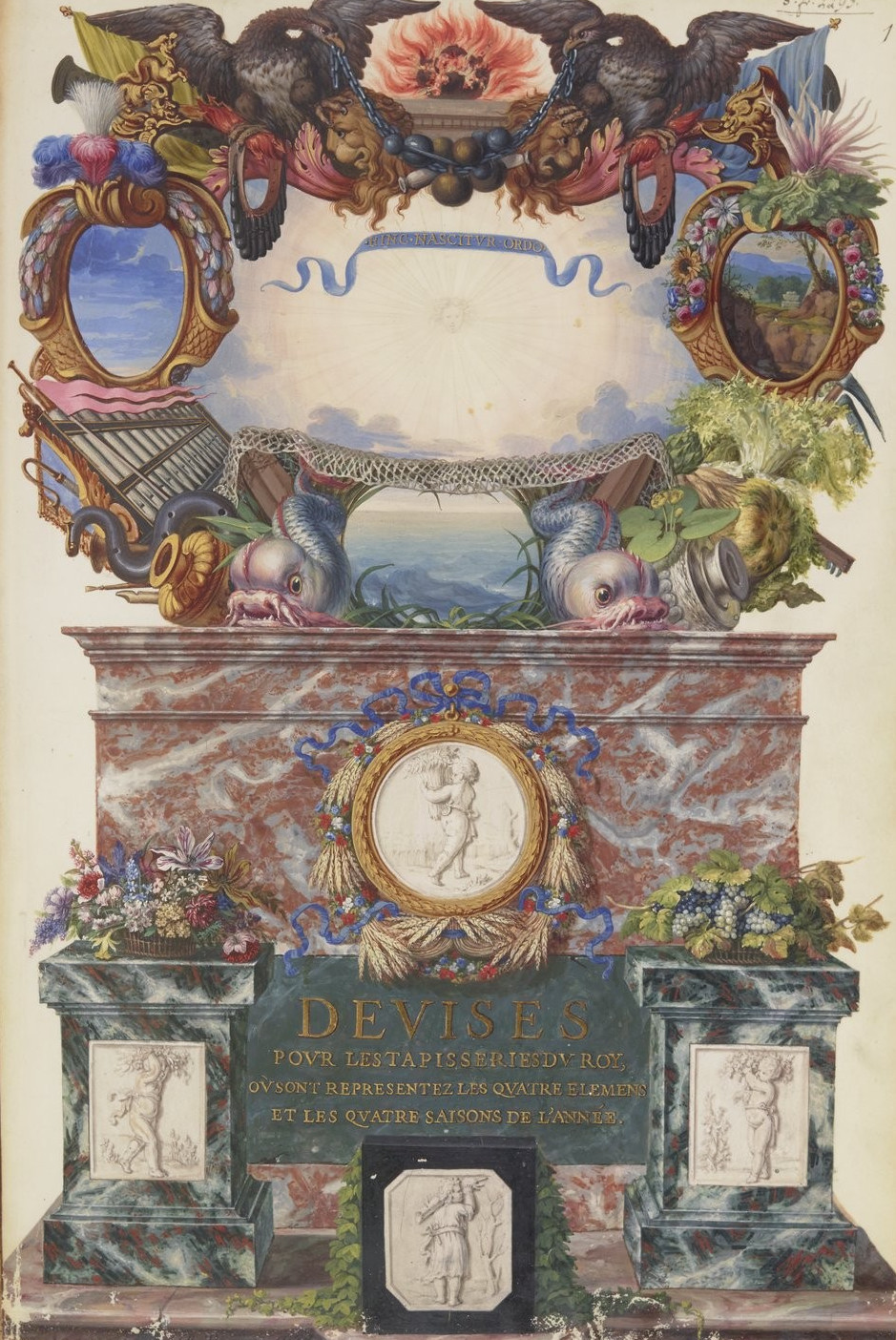 Bibliothèque nationale de France, Département des Manuscrits, Français 7819 : Devises pour les tapisseries du Roy, où sont représentez les quatre Élémens et les quatre Saisons de l’année », par PERRAULT, CHARPENTIER et CASSAGNES, XVIIe siècle. Parchemin, 43 feuillets, 400 × 265 mm, reliure maroquin vert.