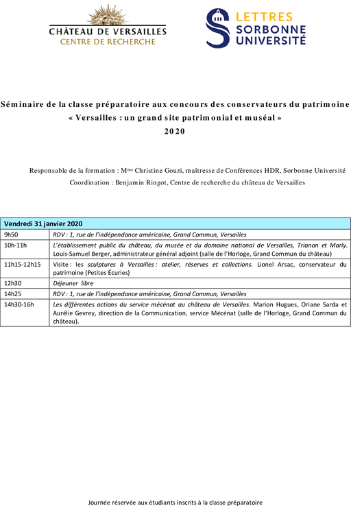 Organisé pour une vingtaine d’élèves de la classe préparatoire au concours des conservateurs du patrimoine de Sorbonne Université, ce séminaire dirigé par Christine Gouzi, maître de conférences en histoire de l’art moderne, alterne exposés et visites menés par des spécialistes sur le thème : « Versailles : un grand site muséal et patrimonial ».