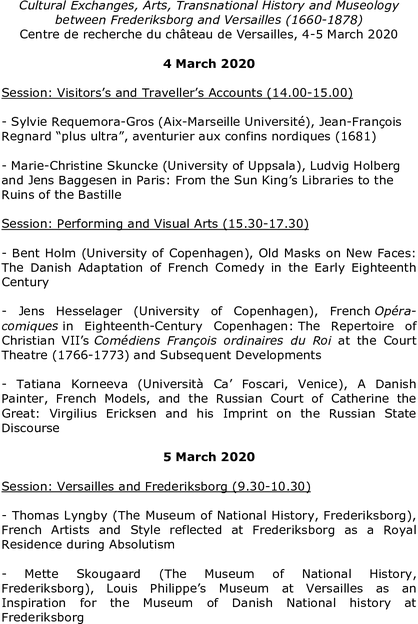 Versailles and Frederiksborg have often been compared by naming Frederiksborg the “Versailles of Denmark” in a naïve and anachronic way. However, both palaces are closely linked by their museology, since the brewer and patron of the arts Jacob Christian Jacobsen visited the Musée de l’histoire de France, instigated by Louis-Philippe and opened in 1837 at Versailles. His visit made a lasting impression on him and he decided to create Det nationalhistoriske museum at Frederiksborg based on the museology of its French counterpart. One of the sessions will be dedicated to studying the conceptions and legacies of both museums in the nineteenth century.