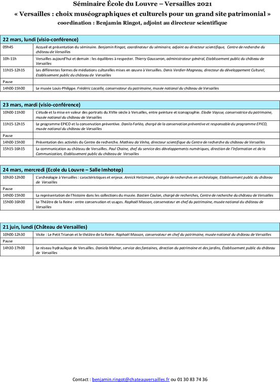 Destiné à une vingtaine d’élèves de l’École du Louvre, ce séminaire alterne exposés de spécialistes et visites du site de Versailles sur le thème « Versailles : choix muséographiques et culturels pour un grand site patrimonial ».