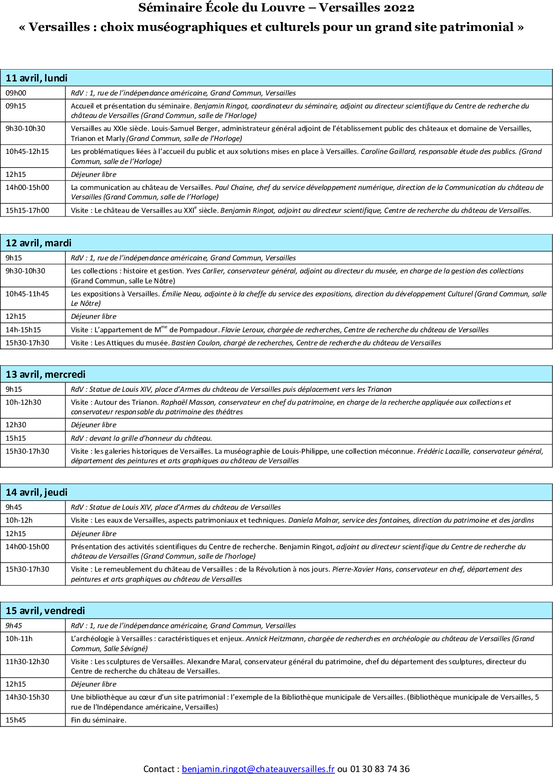 Destiné à une vingtaine d’élèves de l’École du Louvre, ce séminaire alterne exposés de spécialistes et visites du site de Versailles sur le thème « Versailles : choix muséographiques et culturels pour un grand site patrimonial ».