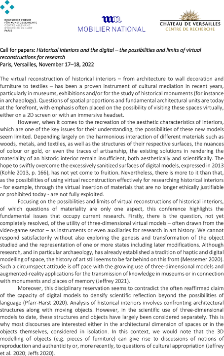 En mettant l’accent sur les intérieurs historiques, ce colloque met en lumière des problèmes fondamentaux de la recherche actuelle. Il s’agit d’abord de la question non encore totalement résolue de l’utilité des modèles virtuels tridimensionnels – souvent issus du secteur des jeux vidéo – en tant qu’instruments voire auxiliaires de la recherche en histoire de l’art. On ne peut y répondre de façon satisfaisante sans interroger également la genèse et la transformation de l’objet étudié et la représentation d’un ou plusieurs états (plan initial, possibilité de masquer des travaux et modifications documentés). Bien que la recherche et en particulier l’archéologie aient déjà établi une tradition au moyen de modélisations haptiques comme numériques de l’espace, l’histoire de l’art semble encore très en retrait sur ce terrain (Messemer 2020). Une telle attitude circonspecte est sans commune mesure avec la croissance continue des modèles tridimensionnels et des applications de réalité augmentée utilisés pour la transmission de connaissances dans les musées, ou encore en lien avec les monuments et les lieux de mémoire (Jeffrey 2021).