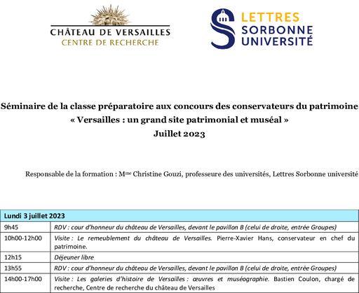 Organisé pour une vingtaine d’élèves de la classe préparatoire au concours des conservateurs du patrimoine de Sorbonne Université, ce séminaire dirigé par Christine Gouzi, professeure d’histoire de l’art moderne, alterne exposés et visites menés par des spécialistes sur le thème : « Versailles : un grand site muséal et patrimonial ».