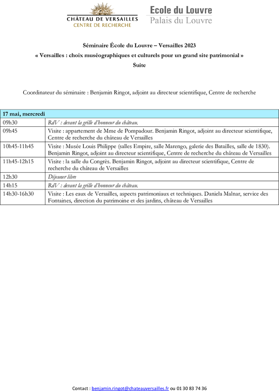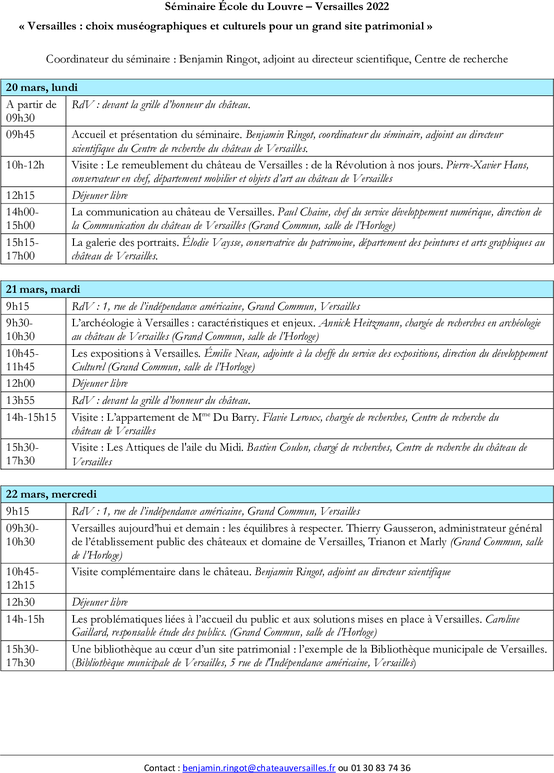 Destiné à une vingtaine d’élèves de l’École du Louvre, ce séminaire alterne exposés de spécialistes et visites du site de Versailles sur le thème « Versailles : choix muséographiques et culturels pour un grand site patrimonial ».