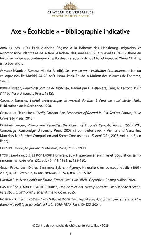 ÉcoNoble propose de relire l’histoire de la cour au prisme de ses acteurs, en adoptant une approche qui leur a jusqu’à présent été peu appliquée : celle de l’histoire économique et sociale. En s’appuyant sur une documentation de première main, le but sera de questionner le paramètre curial pour le circonscrire et en mesurer le poids sur les fortunes de ceux et celles qui fréquentent le souverain et ses résidences, entre le milieu du XVIIe siècle et les premières années de la Révolution. L’hypothèse de travail, qu’il s’agira d’éprouver, est celle d’un enrichissement favorisé par le contexte aulique et d’une interdépendance entre la Couronne et les courtisans. C’est finalement la question de l’épanouissement des élites, au contact du pouvoir, qui sera posée. Cet axe s’inscrit dans le cadre du programme « Réseaux et sociabilités à la cour de France, XVIIe-XVIIIe siècle » du Centre de recherche du château de Versailles, en dialogue avec l’axe prosopographique « PERCOUR – Personnes, charges et réseaux de cour », coordonné par Benjamin Ringot. Il se déploiera à partir de 2027, après une année de préfiguration en 2026.