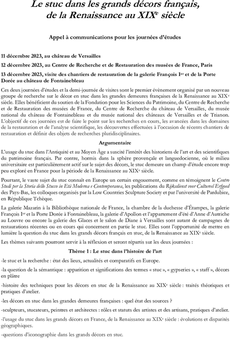 La galerie Mazarin à la Bibliothèque nationale de France, la chambre de la duchesse d’Étampes, la galerie François Ier et la Porte Dorée à Fontainebleau, la galerie d’Apollon et l’appartement d’été d’Anne d’Autriche au Louvre ou encore la galerie des Glaces et le salon de Diane à Versailles sont autant de campagnes de restaurations récentes ou en cours qui concernent en partie le stuc. Elles sont l’opportunité de mettre en lumière la question du stuc dans les grands décors français en stuc, de la Renaissance au XIXe siècle.