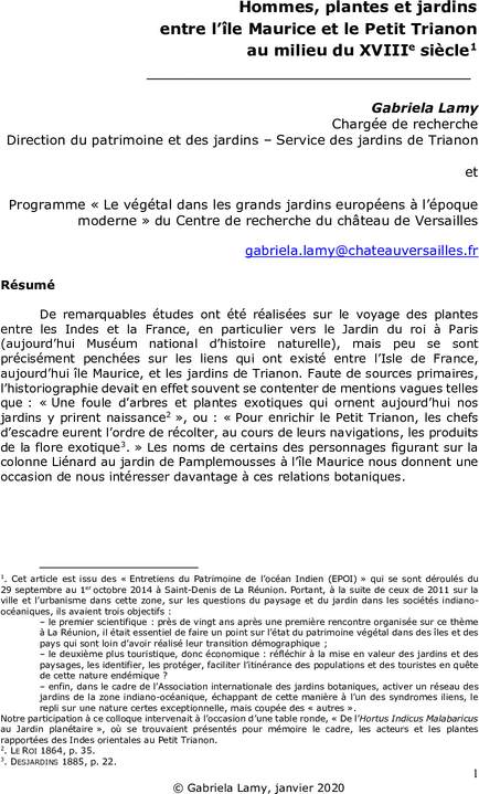 Participation aux « Entretiens du Patrimoine de l’océan Indien (EPOI) » (29 sept. – 1er oct. 2014, Saint-Denis de la Réunion). Texte de Gabriela Lamy, « Hommes, plantes et jardins entre l’île Maurice et le Petit Trianon au milieu du XVIIIe siècle » (2020) issu de ces entretiens :