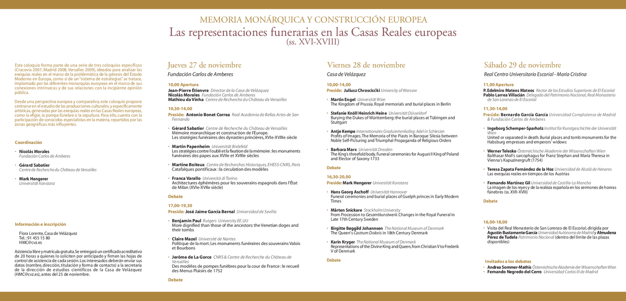 Colloque organisé par la Fundación Carlos de Amberes, la Casa de Velázquez et le Centre de recherche du château de Versailles dans le cadre de son programme de recherche « Mémoire monarchique et construction de l’Europe. Les stratégies funéraires des dynasties princières du XVIe au XVIIIe siècle ».