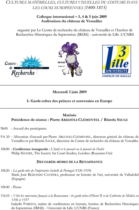 Ce colloque est centré autour de deux thèmes étroitement liés qui sont ceux de la culture matérielle et de la culture visuelle vestimentaires dans les cours européennes. Il se positionne dans une perspective temporelle large, partant de la fin du Moyen Âge, quand s’invente un « corps de mode » et quand les cours prennent leur essor, et s’achevant avec les derniers éclats de la cour impériale française. Il s’inscrit dans trois champs de recherche très actifs : celui des Court Studies, celui de l’histoire de la culture matérielle et celui de la culture des apparences vestimentaires et des cultures visuelles, domaines de recherche actuellement en plein essor. L’approche de la question se veut pluridisciplinaire, associant non seulement historiens, historiens de l’art et conservateurs mais aussi costumiers, ethnologues et spécialistes d’études filmiques.