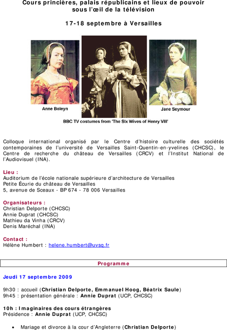 Si les représentations des cours au cinéma a pu susciter l’intérêt des historiens, si la vie des « grands de ce monde » est désormais un thème de recherche (vie mondaine, « peopolisation »), si, bien sûr, les images du pouvoir constituent maintenant un champ de recherche actif, aucune étude d’ampleur, a fortiori dans une perspective de comparaison, n’a été conduite à partir des archives de télévision. Pourtant, compte tenu de son influence, de la diversité de ses genres, de la variété des publics, le petit écran constitue un outil riche et précieux pour saisir les conditions et les formes de construction et de transmission de l’imaginaire historique sur les lieux de pouvoir du passé et ses résonances sur les sociétés contemporaines, pour comprendre aussi le rapport collectif au pouvoir lorsque les cours princières et les palais républicains jaillissent en pleine actualité.