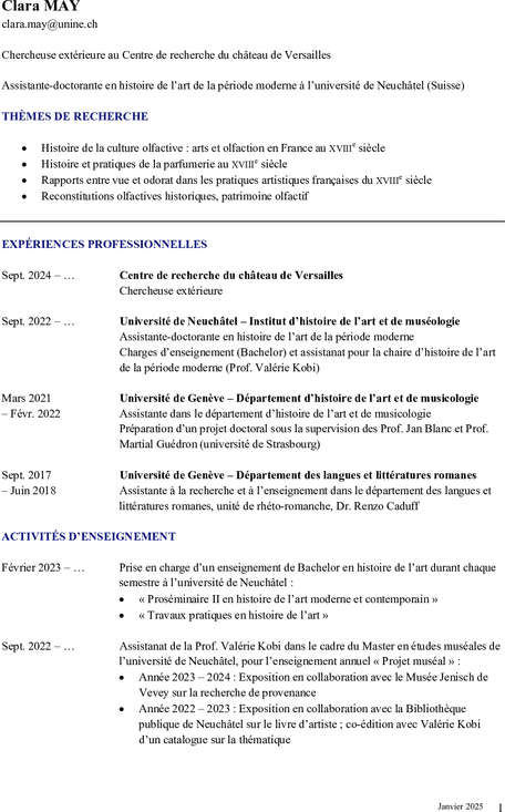 Préparation d’une thèse étudiant les rapports entre arts et parfum au XVIIIe siècle en France.