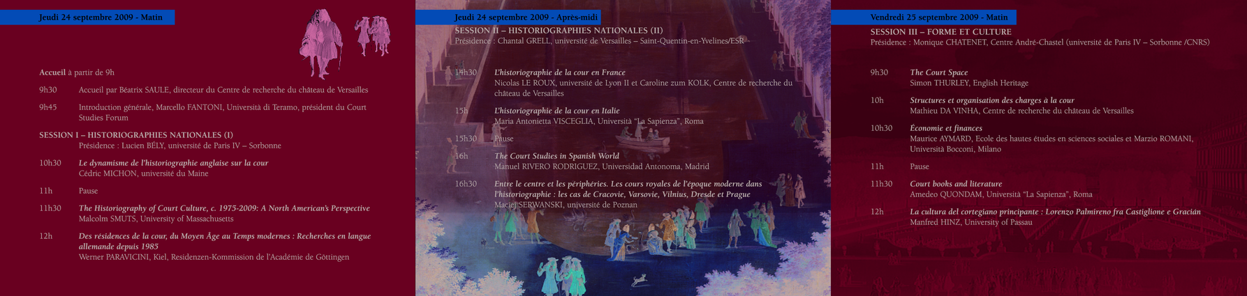 Ce colloque avait donc pour objectif de faire la lumière sur ce nouveau domaine de la recherche et de comprendre son rôle dans l’évolution récente des études historiques. L’accent a été mis sur les trois dernières décennies : la renaissance de l’intérêt de l’historiographie de cour qui eut lieu dans les années 1970, les travaux réalisés suite à la traduction dans les années 1980 de la trilogie de Norbert Elias, et enfin les récents succès des publications comme The origins of the State (1993) et The Princely Courts of Europe (1999).