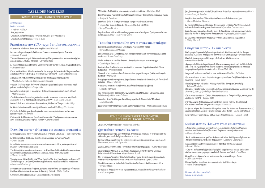 El volumen I trata de las antigüedades y la historiografía, la historia del conocimiento y de las ideas, y el volumen II de las cortes y la diplomacia, las artes y las colecciones.