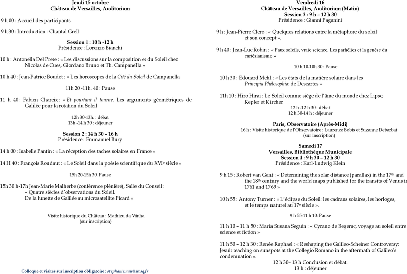Organisé à l’occasion de l’Année Mondiale de l’Astronomie et à l’initiative du réseau « Penser le Ciel » par le Centre d’étude « État, Société et Religion en Europe, Moyen Âge – Temps modernes » de l’université de Versailles Saint-Quentin-en-Yvelines. Accueil par le Centre de recherche et la Bibliothèque municipale de Versailles.
