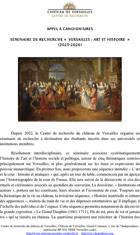 Pour l’année universitaire 2025/2026, le Centre de recherche du château de Versailles organise un séminaire de recherche à destination des étudiants inscrits dans ses universités et institutions membres.