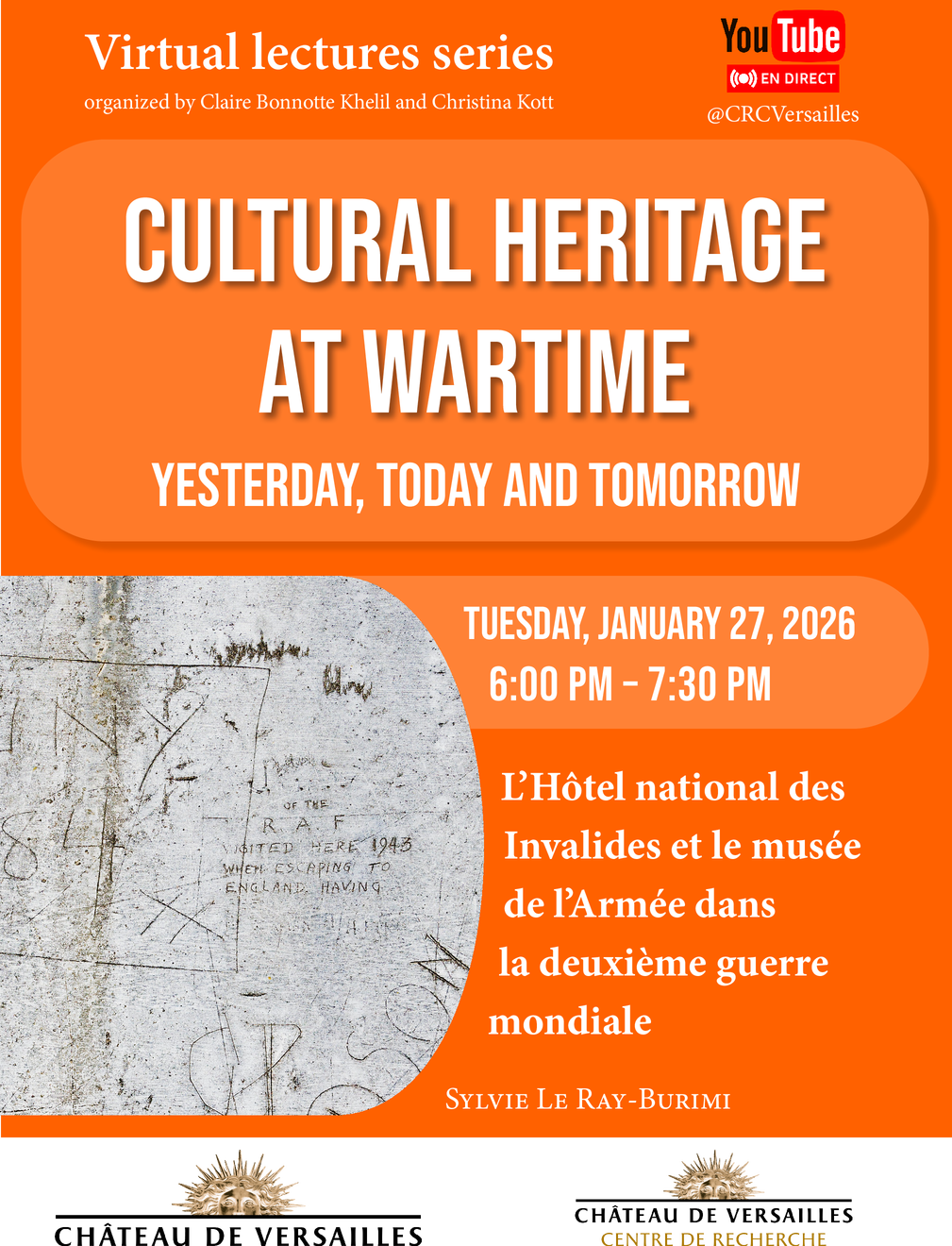 Conférence organisée par le Centre de recherche du château de Versailles et le château de Versailles, dans le cadre du cycle de conférences « Patrimoines culturels en temps de guerre – hier, aujourd’hui et demain », en lien avec le programme Châteaux et musées en Europe : un patrimoine artistique à l’épreuve de la guerre (XIXe-XXe siècle).