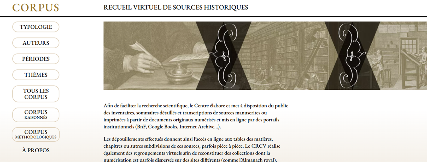 À l’occasion du lancement de son nouveau portail, le CRCV a également mis en ligne un nouveau site consacré à ses corpus électroniques : CORPUS - recueil virtuel de sources historiques.