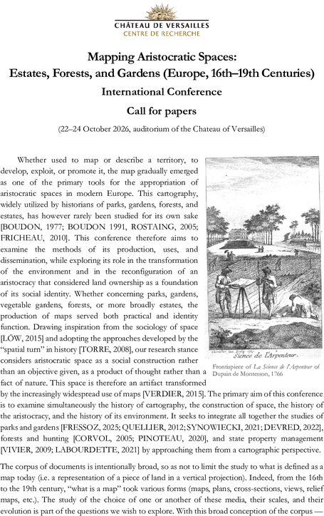 Whether used to map or describe a territory, to develop, exploit, or promote it, the map gradually emerged as one of the primary tools for the appropriation of aristocratic spaces in modern Europe. This cartography, widely utilized by historians of parks, gardens, forests, and estates, has however rarely been studied for its own sake [BOUDON, 1977; BOUDON 1991, ROSTAING, 2005; FRICHEAU, 2010]. This conference therefore aims to examine the methods of its production, uses, and dissemination, while exploring its role in the transformation of the environment and in the reconfiguration of an aristocracy that considered land ownership as a foundation of its social identity. Whether concerning parks, gardens, vegetable gardens, forests, or more broadly estates, the production of maps served both practical and identity function. Drawing inspiration from the sociology of space [LÖW, 2015] and adopting the approaches developed by the “spatial turn” in history [TORRE, 2008], our research stance considers aristocratic space as a social construction rather than an objective given, as a product of thought rather than a fact of nature. This space is therefore an artifact transformed by the increasingly widespread use of maps [VERDIER, 2015]. The primary aim of this conference is to examine simultaneously the history of cartography, the construction of space, the history of the aristocracy, and the history of its environment. It seeks to integrate all together the studies of parks and gardens [FRESSOZ, 2025; QUELLIER, 2012; SYNOWIECKI, 2021; DEVRED, 2022], forests and hunting [CORVOL, 2005; PINOTEAU, 2020], and state property management [VIVIER, 2009; LABOURDETTE, 2021] by approaching them from a cartographic perspective.