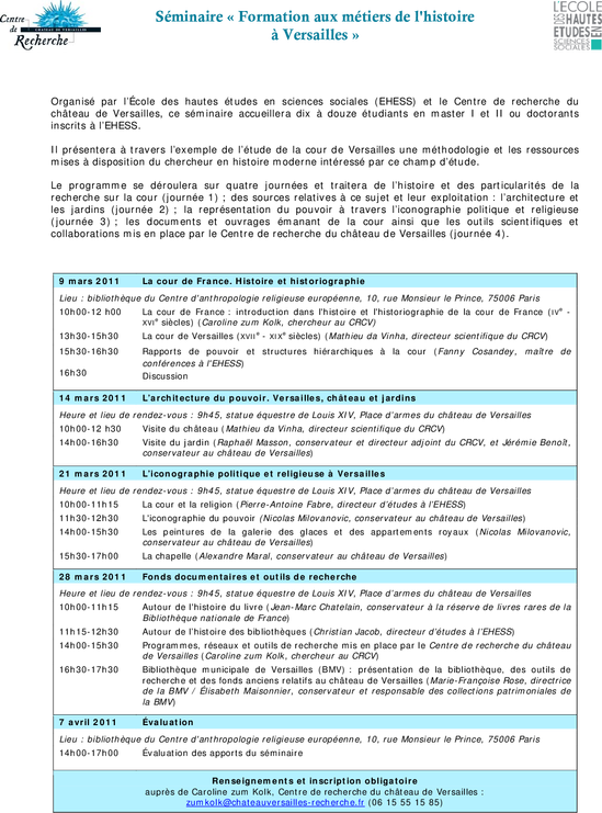 Organisé par l’École des hautes études en sciences sociales (EHESS) et le Centre de recherche du château de Versailles, ce séminaire accueille dix à douze étudiants en master I et II ou doctorants inscrits à l’EHESS.