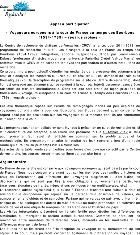 Dans cet axe sera traité de façon prioritaire le thème des « Voyageurs européens à la cour de France au temps des Bourbons (1594-1789) : regards croisés ».