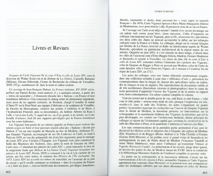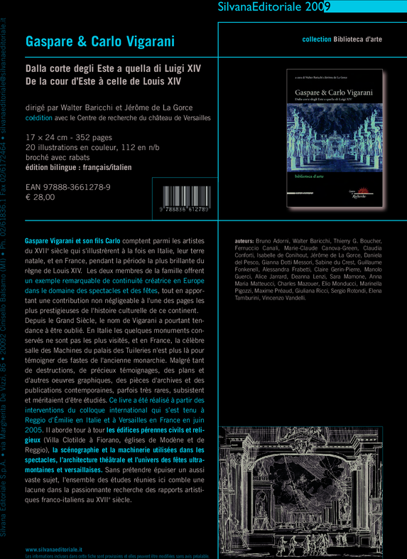 Gaspare e Carlo Vigarani : Dalla corte degli Este a quella di Luigi XIV - De la cour d’Este à celle de Louis XIV, (actes du colloque international des 6, 7, 9 et 10 juin 2005 à Versailles et en Italie), sous la direction de Jérôme de la Gorce et de Walter Baricchi, coédition Silvana Editoriale / Centre de recherche du château de Versailles (collection « Biblioteca d’arte »), octobre 2009, 17 x 24 cm, 352 p., 94 ill. noir et blanc, 20 pl. couleur, index, édition bilingue français/italien, 28€ (ISBN : 978-88-366-1278-9).
