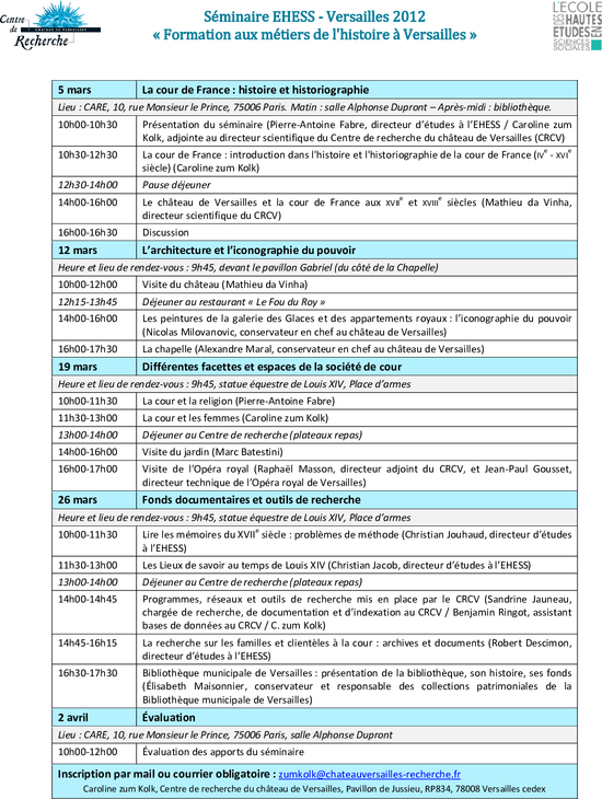 Organisé par l’École des hautes études en sciences sociales (EHESS) et le Centre de recherche du château de Versailles, ce séminaire accueille une dizaine d’étudiants inscrits en master I et II ou doctorants à l’EHESS.