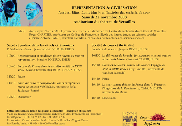 Cette journée d’études a permis de mettre en parallèle la conception de Norbert Elias, issue d’une histoire sociale des pratiques culturelles, et celle de Louis Marin, née de la sémiologie des représentations, afin de faire apparaître le « procès de civilisation » comme un processus de symbolisation et de comprendre la société de cour comme un lieu de convergence concrète de la sociologie et de la sémiologie des sociétés d’Ancien Régime. Les travaux présentés par l’ensemble des spécialistes réunis pour cette occasion autour de quatre points cardinaux de la vie de cour – la politique, la religion, les rites et les spectacles - ont ouvert à une nouvelle lecture de l’œuvre d’Elias, revisitée comme une critique du discours de la société d’Ancien Régime, et à une nouvelle exploration de l’œuvre de Louis Marin, familier du règne de Louis XIV, à la lumière d’autres cultures de cour de l’Europe moderne.