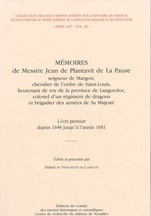Mémoires de Messire Jean de Plantavit de La Pause, seigneur de Margon, chevalier de l’ordre de Saint-Louis, lieutenant de roy de la province de Languedoc, colonel d’un régiment de dragons et brigadier des armées de Sa Majesté, Volume 1, from 1646 to 1681, edited and introduced by Hubert de Vergnette de Lamotte, joint publication Centre de recherche du château de Versailles / Éditions du Comité des travaux historiques et scientifiques (“Documents inédits sur l’histoire de France” Collection), October 2011, 375 p., 15 x 23 cm, €50 (ISBN: 978-2-7355-0765-8).
