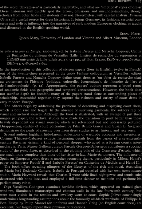 Se vêtir à la cour en Europe, 1400-1815, (publication from the international symposium held on 3,4 and 5 June, 2009), directed by Isabelle Paresys and Natacha Coquery, joint publication Centre de recherche du château de Versailles / Institut de Recherches Historiques du Septentrion (IRHIS) of the Université Lille 3-Charles-de-Gaulle / Centre de Gestion de l’Édition Scientifique (“Histoire et Littérature de l’Europe du Nord-Ouest” Collection), October 2011, 16 x 24 cm, 350 p., 50 ill., €23 (ISBN: 978-2-905637-64-2).
