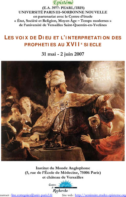 Actes parus : Les voix de Dieu. Littérature et prophétie en Angleterre et en France à l’âge baroque, Line Cottegnies, Claire Gheeraert-Graffeuille, Tony Gheeraert, Anne-Marie Miller-Blaise et Gisèle Venet (éds.), Éditions Presses Sorbonne Nouvelle, Nancy, juillet 2008, 16 x 24 cm, 316 p., 23 €.