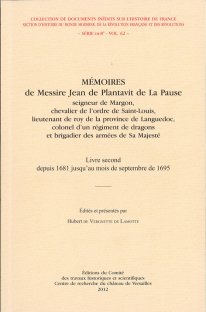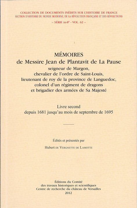 Mémoires de Messire Jean de Plantavit de La Pause, seigneur de Margon, chevalier de l’ordre de Saint-Louis, lieutenant de roy de la province de Languedoc, colonel d’un régiment de dragons et brigadier des armées de Sa Majesté, Volume 2, from 1681 to 1695, edited and introduced by Hubert de Vergnette de Lamotte, joint publication Centre de recherche du château de Versailles / Éditions du Comité des travaux historiques et scientifiques (“Documents inédits sur l’histoire de France” Collection), October 2012, 389 p., 15 x 23 cm, 8 black & white illustrations, €50,70 (ISBN: 978-2-7355-0775-7).